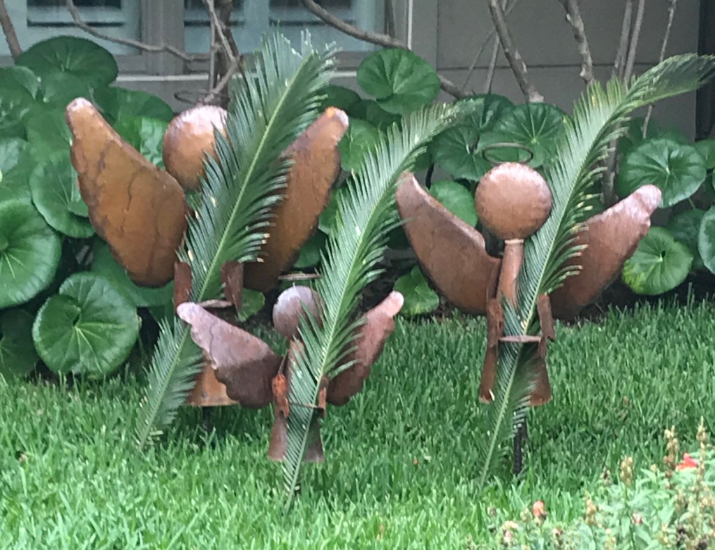 Sunday morning I cut two palm branches and hung them on the railing of my stoop. Seems I was not the only one who wanted to share a bit of liturgy with the neighbors as I saw this vignette of yard angels holding palm branches on Tuesday in my neighborhood.